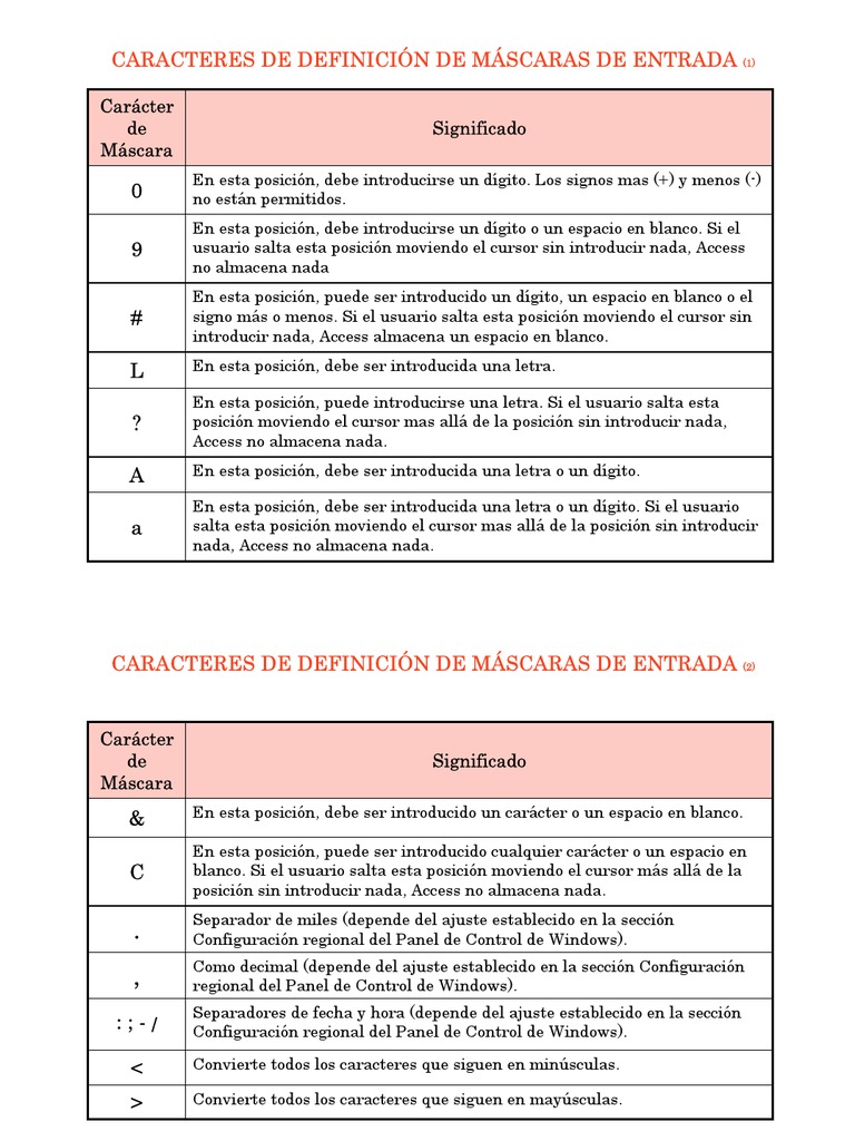 Caracteres válidos de máscaras de entrada Microsoft Access interpreta los caracteres de la primera sección de la definición de la propiedad Máscara de entrada (InputMask) tal como se muestra en la tabla siguiente. Mascara de entrada: Permite tornar a entrada de dados mais fácil e controlar os valores que os usuários podem inserir em um controle que receba texto. Sin duda, usted poner un montón de tiempo y esfuerzo en la creación de bases de datos Access.